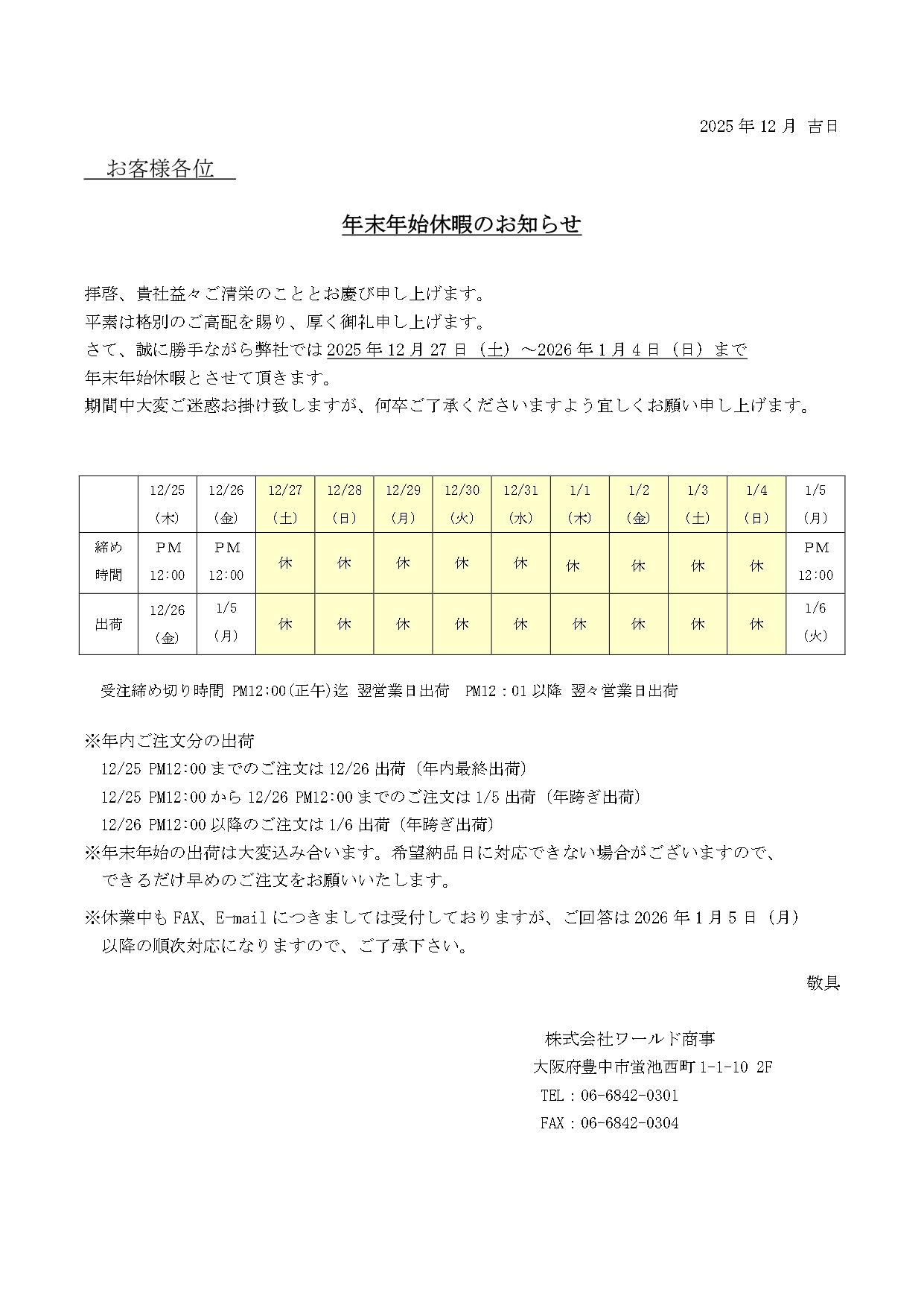 ※休業中もFAX、E-mailにつきましては受付しておりますが、ご回答は2026年1月5日(月)以降の順次対応になりますのでご了承下さい。